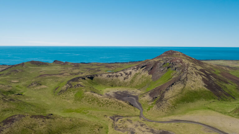 A bench is located in one of the craters and has a beautiful view of Snæfellsjökull glacier.