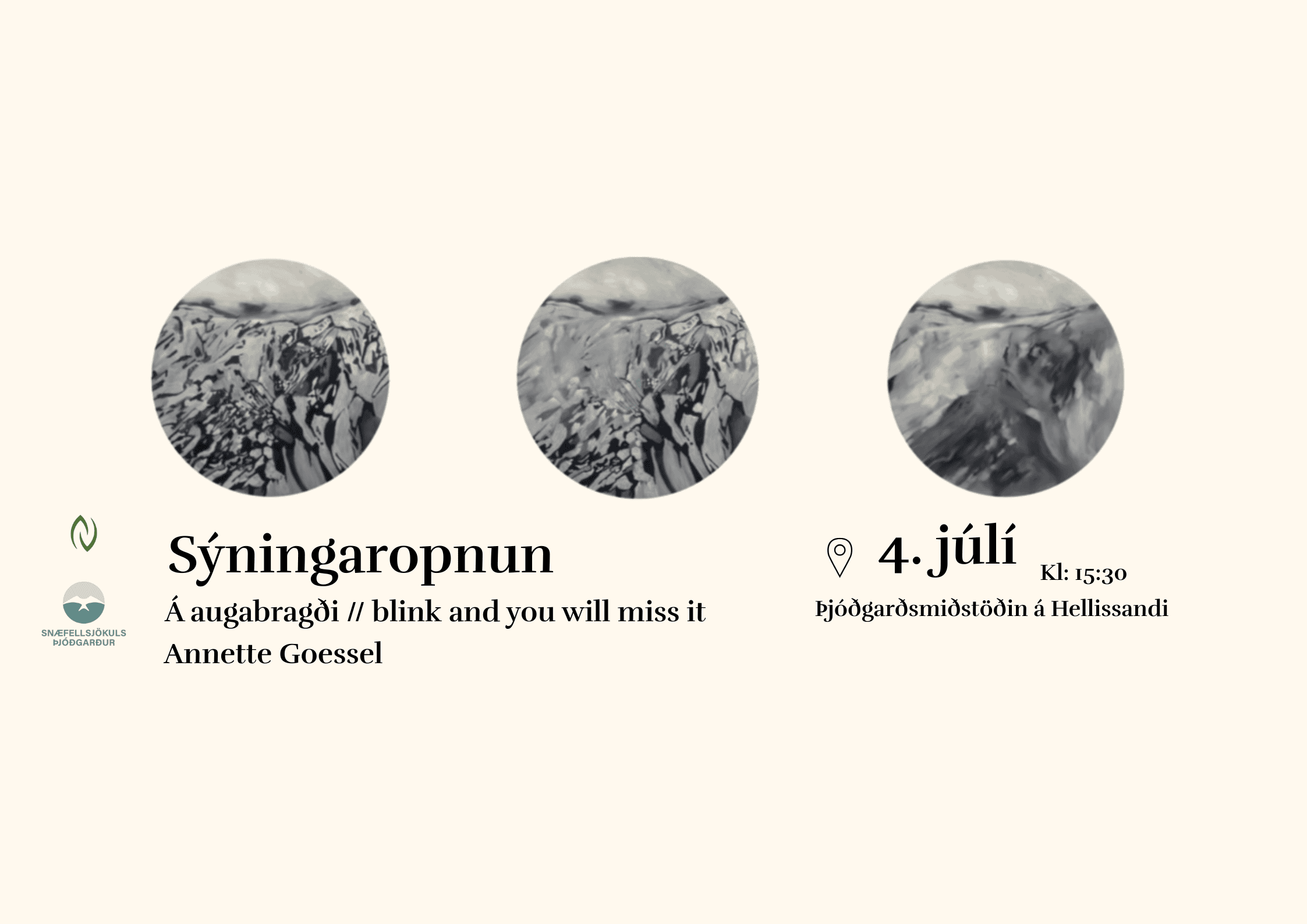 Það er okkur sönn ánægja að bjóða ykkur velkomin á opnun listsýningar Annette Goessel, í Þjóðgarðsmiðstöðinni á Hellissandi föstudaginn 4. júlí kl. 15:30.